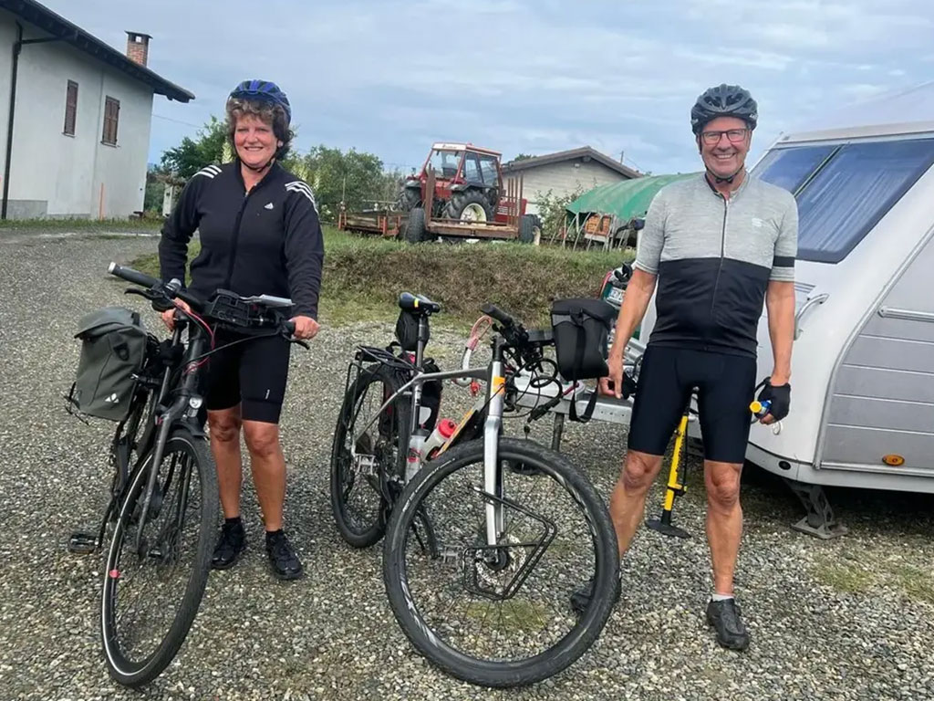Wij ontmoetten Aad van Opstal tijdens een vakantiebeurs in de Stevenskerk in Nijmegen. Het sprak ons aan om in de Piemonte te fietsen. Wanneer wij samen fietsen gaat Karin doorgaans op de e-bike en ik op een trekkingfiets, zodat we allebei lekker fietsen in ongeveer hetzelfde tempo. Dat wilden wij ook graag op die manier doen in de Piemonte. Aad waarschuwde dat de dagtochten toegesneden zijn op ebikes met krachtige motoren en voor reguliere fietsen erg pittig zijn. Bij navraag heb ik de GPX-en en de hoogteprofielen van de dagtochten goed bestudeerd en geoordeeld dat het wel te doen moest zijn voor mij op mijn trekkingfiets. Ter toelichting: ik ben wel een geoefend vrijetijd-fietser, maar geen topper.